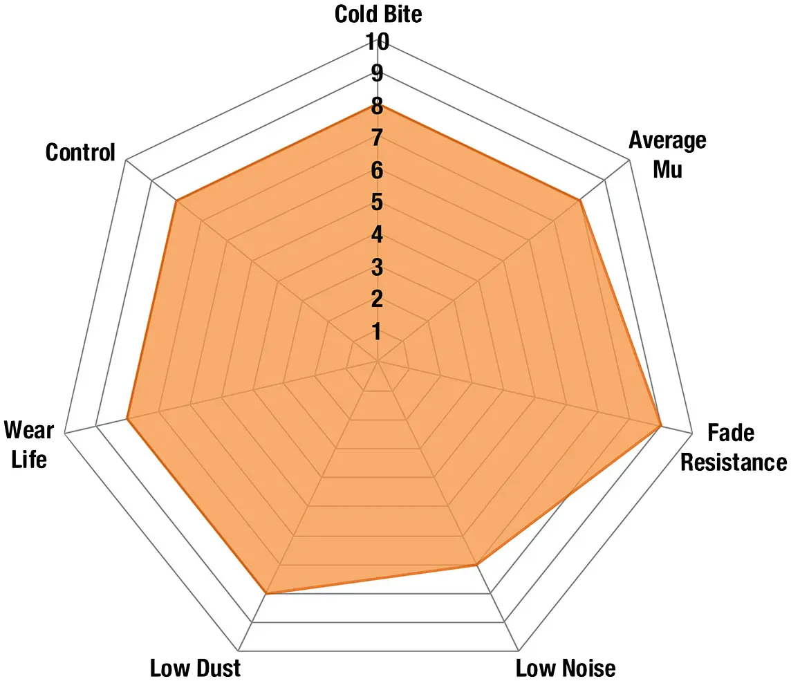 La pastiglia EBC Orangestuff è una pastiglia da gara completamente nuova, progettata appositamente per l’uso in pista. Le profonde scanalature a “V” nella pastiglia servono a trattenere sporco, detriti e polvere, oltre che a favorire la ventilazione. La pastiglia Orangestuff utilizza un sistema a strati intermedi che garantisce un legame molto più forte nella mescola, per una maggiore resistenza nelle condizioni di gara più difficili. Ciò consente una resistenza tre volte superiore rispetto alle normali pastiglie organiche per uso stradale. Le pastiglie Orangestuff sono pre-bruciate, il che significa che sono già rodate rispetto alle pastiglie normali, ma consigliamo di eseguire una procedura di rodaggio minima per abbinare la pastiglia al disco. Si consigliano due giri a velocità intermedia, seguiti da altri due con frenate più intense. Queste pastiglie non sono testate R90 per l’uso su strada e sono prodotte esclusivamente per l’uso in gara e in pista.