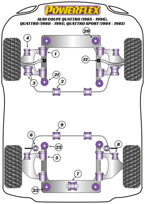 Powerflex Audi 80 / 90 – incl. S2/RS2 & Quattro (1976 – 2000) Sport Quattro (1984-1985) Coupe Quattro (1985-1991) UR Quattro (1980-1991) Boccola del braccio oscillante anteriore Fig.1 (4) PFF3-101